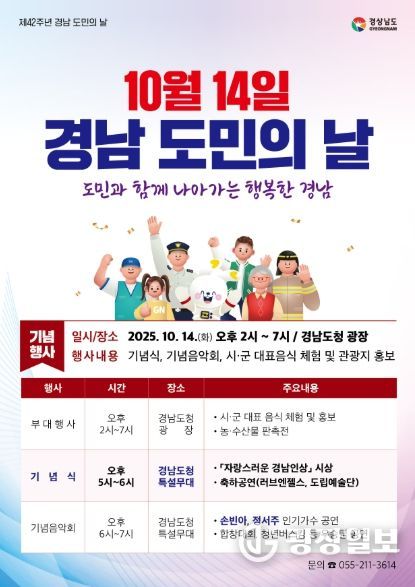 광장일보 주재영 기자 | 경상남도는 10월 14일 오후 2시부터 7시까지 경남도청 광장 일원에서 ‘제42회 도민의 날’ 행사를 개최한다고 밝혔다.
