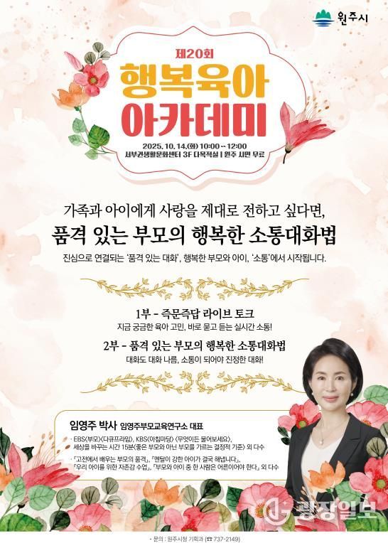 광장일보 이현나 기자 | 원주시는 10월 14일 오전 10시, 서원주생활문화센터 3층 임영주 임영주부모교육연구소 대표와 함께 ‘제20회 행복육아 아카데미’를 개최한다.