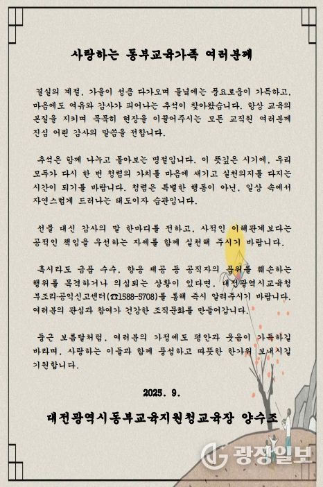광장일보 이현나 기자 | 대전동·서부교육지원청은 추석 명절을 맞이하여 청렴 실천의지를 담은 교육장 서한문을 관내 유·초·중학교 및 교육지원청 교직원들에게 발송하고 안내했다.