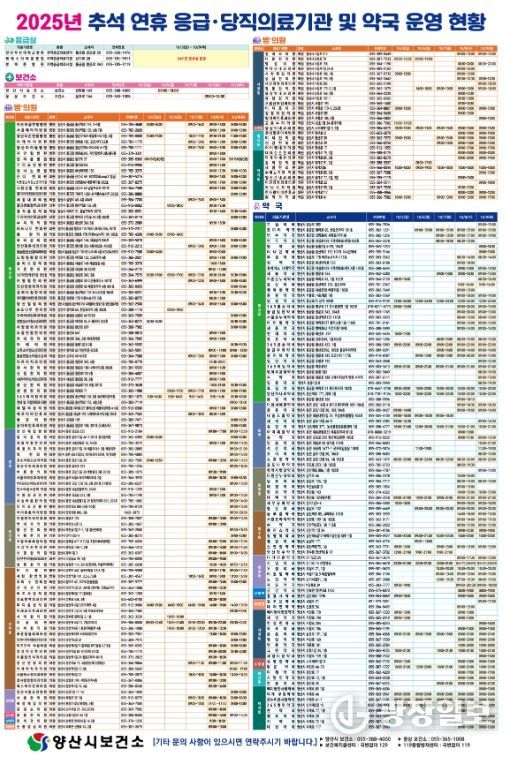연휴 동안 진료 가능한 의료기관과 약국 정보는 응급의료포털(e-gen), 양산시청·보건소 홈페이지 또는 응급똑똑 앱에서 확인할 수 있다.