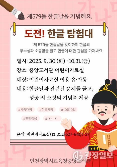 광장일보 주재영 기자 | 인천광역시교육청중앙도서관은 제579돌 한글날을 맞아 9월 30일부터 10월 31일까지 어린이들이 즐겁게 한글을 배우고 도서관을 체험할 수 있는 특별행사 ‘도전! 한글 탐험대!’를 운영한다.