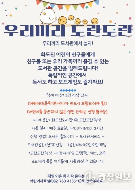자세한 사항은 화도진도서관 누리집공지사항을 확인하거나 어린이자료실로 문의하면 된다.