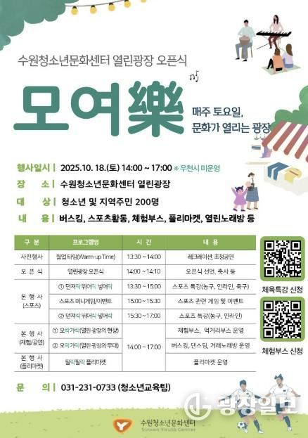 광장일보 나학천 기자 | 수원시청소년청년재단 청소년문화센터는 오는 10월 18일 청소년문화센터 야외광장에서'열린광장 오픈식‘모여락(樂')을 개최한다.
