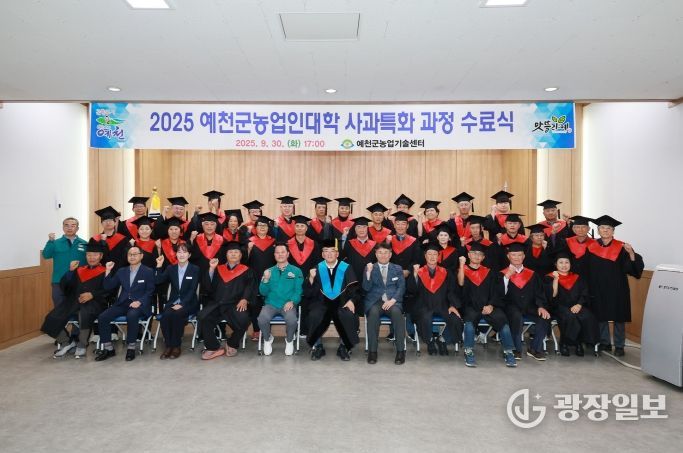 광장일보 주재영 기자 | 예천군은 30일, 농업인대학생 40여 명이 참석한 가운데 ‘예천군농업인대학 사과 특화과정 수료식’을 개최했다. 이 자리에는 김학동 군수와 강영구 군의회 의장, 도기욱 경북도의원 등 주요 인사들도 참여해 수료자들을 축하했다.