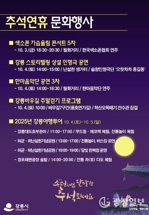광장일보 이현나 기자 | 강릉시는 역대 최장 추석 연휴를 맞아 시민과 귀성객, 관광객들이 즐길 수 있는 다양한 문화행사를 도심과 해변 곳곳에서 개최한다.