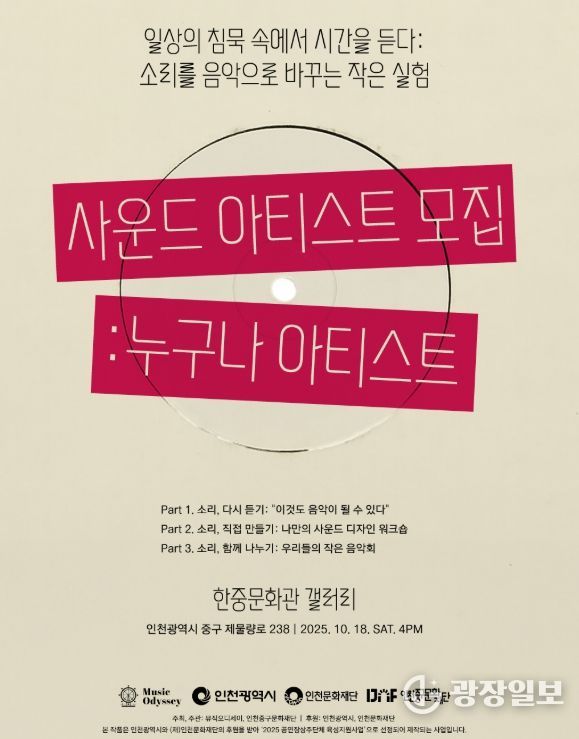 광장일보 주재영 기자 | (재)인천중구문화재단은 상주단체 ‘뮤직오디세이’의 시민참여 퍼블릭프로그램 〈일상의 침묵 속에서 시간을 듣다'에 함께할 참가자를 선착순 모집한다고 1일 밝혔다.