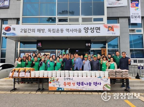 광장일보 주재영 기자 | 양성면새마을지도자․부녀회는 9월 30일 양성면 행정복지센터 앞 주차장에서 “추석맞이 송편 행복 나눔” 행사를 진행했다. 이번 행사는 민족 최대 명절인 추석을 맞아 지역 내 취약계층에게 따뜻한 정을 나누고, 모두가 풍성한 한가위를 보낼 수 있도록 돕기 위해 마련됐다.