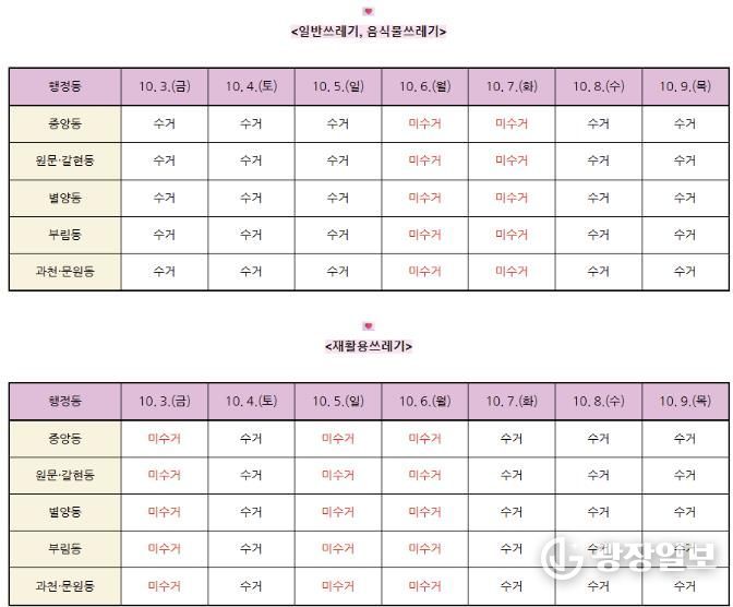 생활폐기물 수거는 일반 쓰레기의 경우 3일, 4일, 5일, 8일, 9일에, 재활용 쓰레기는 4일, 7일, 8일, 9일에 각각 수거된다.