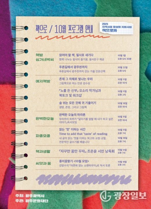 광장일보 주재영 기자 | 광주문화재단이 추진 중인 ‘2025 지역서점 활성화 지원사업 - 책으로(路)’가 독서의 계절 10월을 맞아 한층 다채로운 프로그램으로 시민들을 찾아간다.