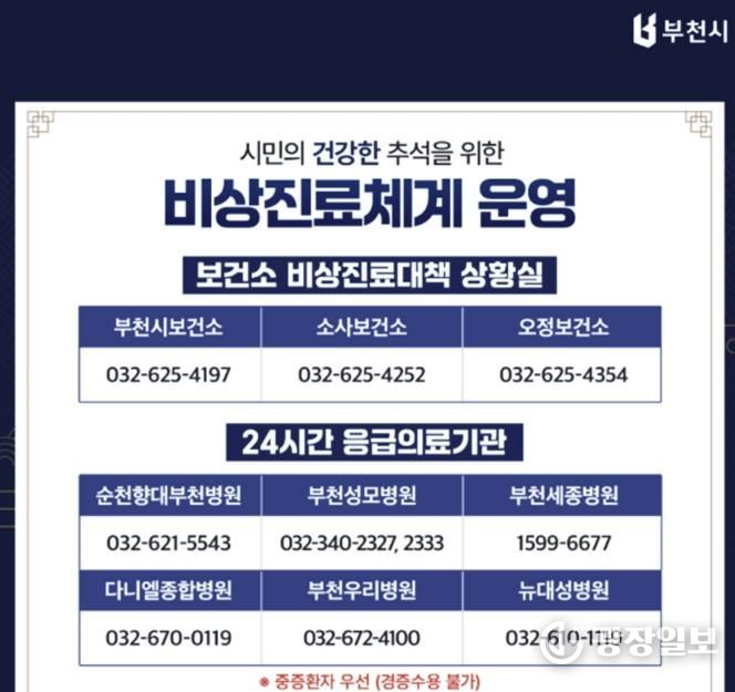광장일보 주재영 기자 | 부천시는 추석 연휴 동안 진료 공백을 최소화하기 위해 관내 의료기관과 약국의 협력으로 비상 진료체계를 운영한다.
