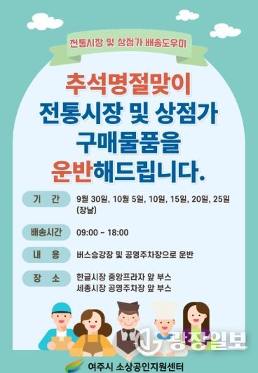 광장일보 주재영 기자 | 여주시는 여주시소상공인지원센터 주관으로 다가오는 추석 명절을 맞이하여 전통시장과 상점가를 찾는 시민들의 편의를 돕고 전통시장 활성화를 위해 ‘전통시장 및 상점가 배송 도우미’ 서비스를 운영한다.