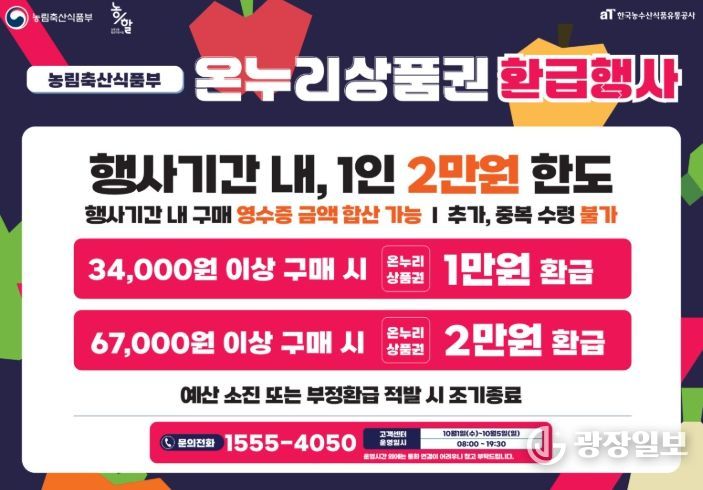 행사 기간 동안 해당 시장에서 국산 농축산물을 구매한 소비자들에게 1인당 2만 원 한도에서 구매 금액의 최대 30%를 온누리상품권으로 환급해준다.