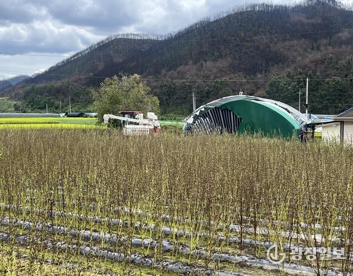 콩 콤바인 구조를 변형한 전용 콤바인으로 수확하면 베기와 탈곡(낱알 떨기)을 동시에 수행할 수 있어 작업시간이 기존 방식 대비 약 99% 절감된다.