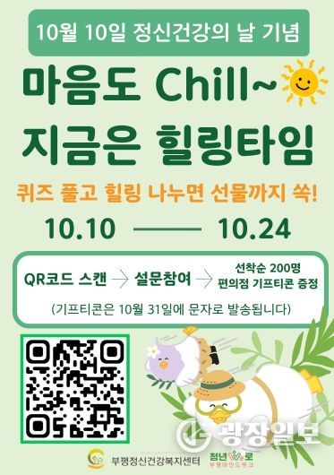 광장일보 주재영 기자 | 부평구 부평정신건강복지센터는 세계 정신건강의 날(10월 10일)을 맞아 10일부터 24일까지 ‘온라인 힐링 캠페인’을 진행한다.