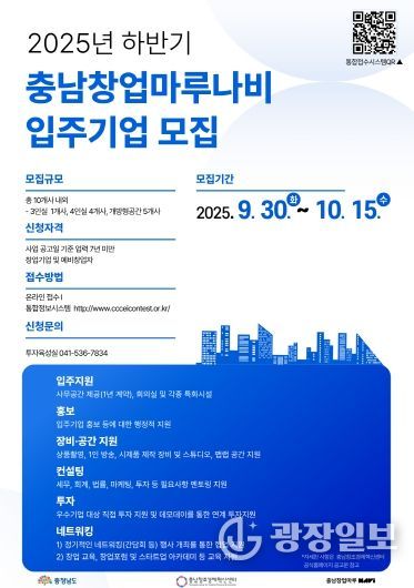 광장일보 주재영 기자 | (재)충남창조경제혁신센터는 오는 10월 15일까지 2025년 하반기 충남창업마루나비 입주기업을 모집한다고 밝혔다. 이번 모집은 혁신적인 아이디어와 성장 잠재력을 지닌 스타트업을 발굴해 안정적인 보육 환경을 제공하고, 기업의 지속적인 성장을 지원하기 위해 추진된다.