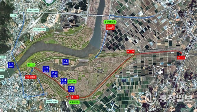 축제장에서 나가는 길은 제 1주차장의 경우 입구 반대편 출구를 이용해 물넘이 구간 삼거리로 진입해 제방도로나 영산천 방향으로 빠져나가면 된다. 또 축제장이나 인근 임시주차장 이용 차량이 행사장에서 나올 때는 영산천이나 전남외국어고교 방향으로 빠져나가도록 했다.