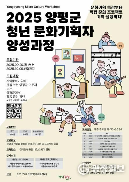 광장일보 주재영 기자 | 양평군은 청년들의 문화·예술 기획 역량 강화를 통해 지역사회 문화 활성화와 청년 일자리 창출을 지원하고자 ‘2025년 양평군 청년 문화기획자 양성과정’을 10월부터 12월까지 운영한다고 밝혔다.