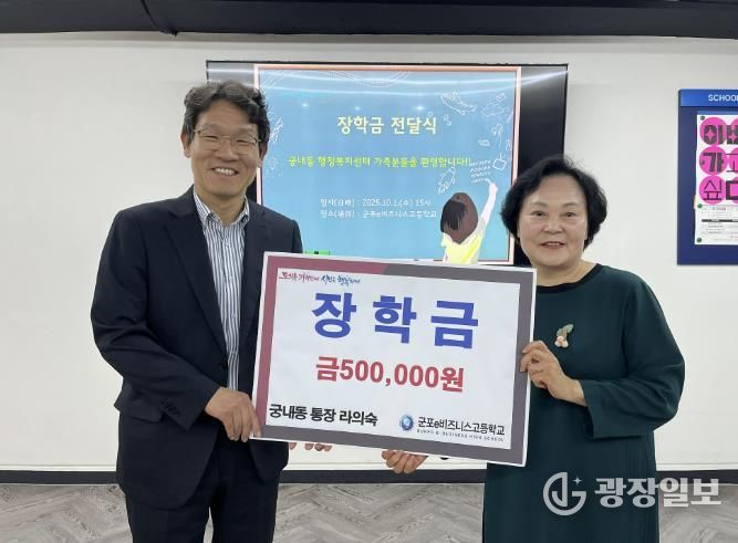 광장일보 주재영 기자 | 라의숙 군포시 궁내동통장협의회장은 10월 1일 군포e비즈니스고등학교에 장학금을 전달하며 지역 청소년들의 꿈을 응원하는 뜻깊은 나눔을 실천했다.