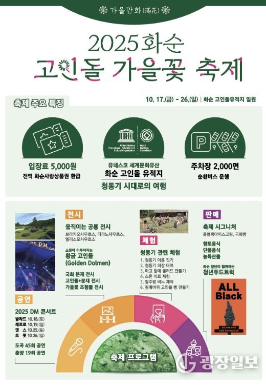 화순군 대표 축제로 '23, 24년 2년 연속 축제 콘텐츠 대상에 선정된'2025 화순 고인돌 가을꽃 축제'는 가을꽃과 청동기 체험, ‘가을만화’와 ‘고인돌 유니버스’로 정체성과 재미를 강화해 총 7개 구역에서 부대행사(2개) 포함 총 24개의 프로그램을 운영한다.