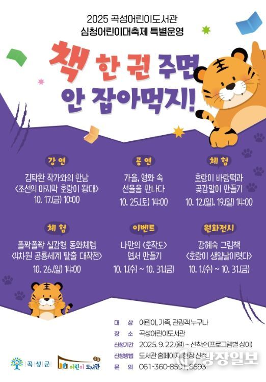 광장일보 주재영 기자 | 곡성군은 다가오는 제25회 곡성심청어린이대축제를 기념하여 10월 한 달간 곡성어린이도서관에서 지역민과 방문객을 위한 다양한 볼거리와 독서문화 프로그램을 운영한다고 2일 밝혔다.