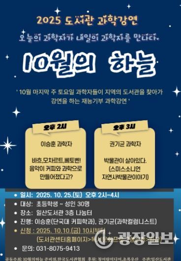 광장일보 주재영 기자 | 고양특례시 일산도서관에서는 과학자들의 재능기부 도서관 과학 강연프로그램 ‘10월의 하늘’을 운영한다.