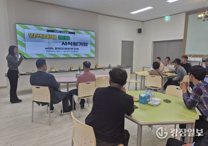 광장일보 이현나 기자 | 평창군은 평창군멜론연구회와 함께 2일 오후 11시 스마트팜에서 양액재배 멜론 시식평가회를 개최했다. 이번 시험재배에서는 평창군 멜론 농업인들이 주로 재배하는 2품종(아티스트, 탤런트)에 과육이 주황색인 칸탈로프 2품종(아모르, 다들멜론)을 추가로 시험재배했다.