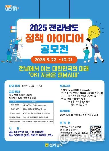 광장일보 주재영 기자 | 전라남도가 새 정부의 실용주의 기조에 맞춰 ‘생활 속 불편을 찾고 이를 개선할, 지역의 미래를 먹여 살릴 정책’을 주제로 ‘2025년 전라남도 정책 아이디어 공모전’을 개최한다.