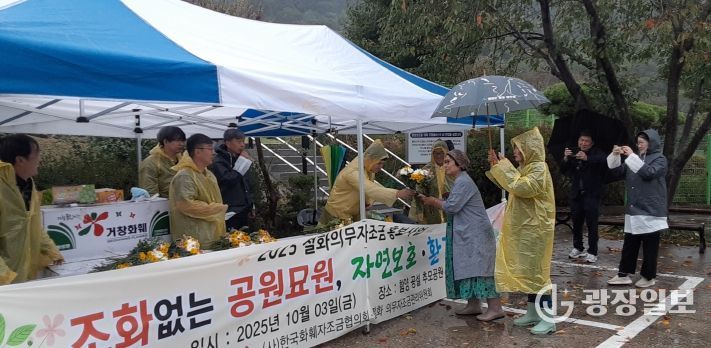 광장일보 주재영 기자 | 함양군은 추석 연휴 첫날인 3일 공설추모공원에서 성묘객을 대상으로 ‘플라스틱 조화 근절 행사’를 열고 친환경 추모 문화 확산에 나섰다고 밝혔다.