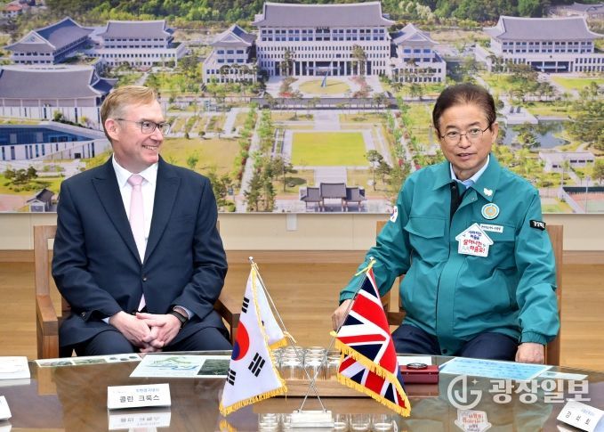 광장일보 주재영 기자 | 이철우 경상북도지사는 3일 도청을 방문한 콜린 크룩스(Colin Crooks) 주한 영국대사 내외와 만나, 경주 APEC 정상회의의 성공적 개최 협력 방안과 함께 산업·문화·교육 등 다양한 분야의 교류 확대를 논의했다.