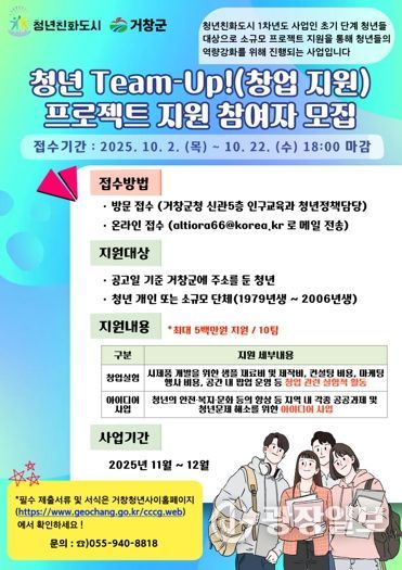 광장일보 주재영 기자 | 거창군은 지역 청년들의 창의적 도전과 자립적 성장을 지원하기 위해 오는 10월 22일까지 청년 Team-up(창업지원) 프로젝트 참여자를 모집한다.