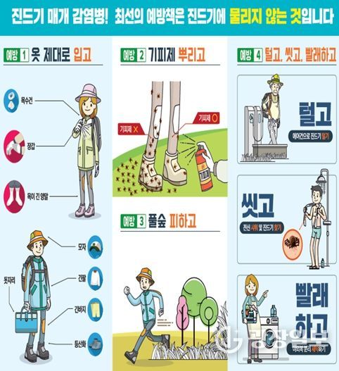 강윤선 공공보건의료과장은 “진드기 매개 감염병 예방을 위해서는 개인별 예방수칙을 준수하고 야외활동 후 발열·구토·설사 증상이 나타나면 의료기관에 방문해 진료를 받을 것”을 당부했다.
