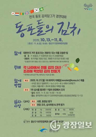 광장일보 주재영 기자 | 광주 광산구가 13일부터 11월 18일까지 전국 곳곳에 거주하고 있는 동포들을 대상으로 ‘전국 동포 김치담그기 경연대회_동포들의 김치’를 개최한다.