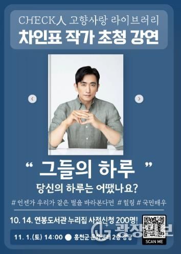 광장일보 이현나 기자 | 홍천군립도서관은 11월 1일 오후 2시 홍천군 문화센터 2층 강당에서 차인표 작가를 초청하여 체크인 고향사랑 라이브러리 마지막 강연을 개최한다.