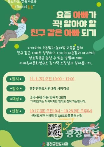 광장일보 이현나 기자 | 홍천군립도서관은 지역 내 아동들과 양육자가 책으로 소통할 수 있는 북스타트 양육자 교육으로 '요즘 아빠가 꼭! 알아야 할 친구 같은 아빠 되기'를 연봉도서관에서 11월 01일 오전 10시에 진행한다.