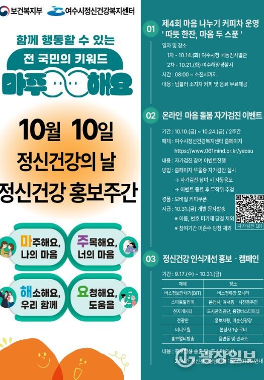 광장일보 주재영 기자 | 여수시는 정신건강의 날(10월 10일)을 기념해 10월 10일부터 24일까지 ‘2025년 정신건강 홍보주간’을 운영한다.