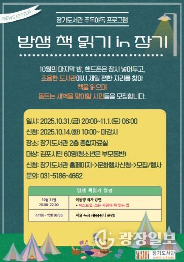 광장일보 이현나 기자 | 김포시 장기도서관은 주독야독 프로그램인 '밤샘 책 읽기 인(in) 장기'를 10월 31일 오후 8시부터 11월 1일 오전 6시까지 장기도서관에서 진행한다고 밝혔다.