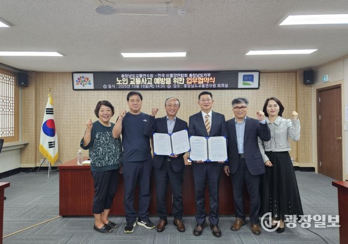 광장일보 주재영 기자 | 충청남도교통연수원(원장 박종민)과 전국이·통장연합회 충청남도지부(지부장 박인철)는 지난 16일 충남교통연수원 회의실에서 도민 교통안전 홍보 강화를 위한 업무협약(MOU)을 체결했다. 이번 협약은 충남의 교통사망사고 중 절반 이상을 차지하는 노인층의 교통사고를 예방하고, 지역사회 중심의 생활밀착형 교통안전 홍보체계를 강화하기 위한 민·관 협력의 일환으로 추진됐다.