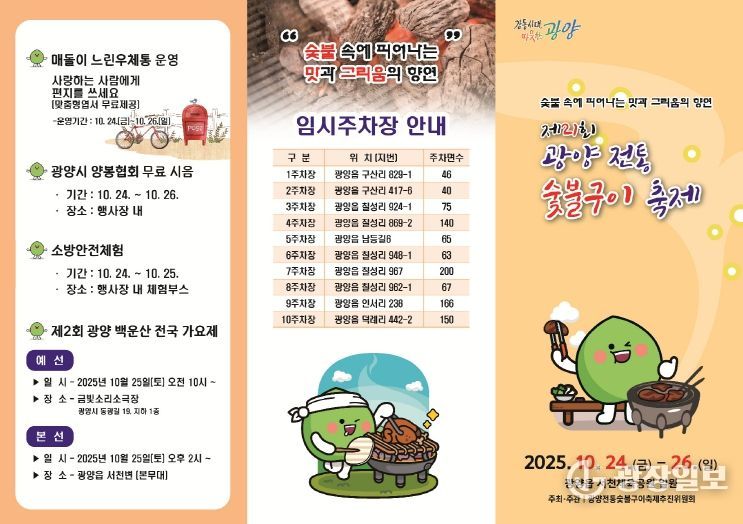 광장일보 주재영 기자 | 광양전통숯불구이축제추진위원회(위원장 우승배)는 10월 24일부터 26일까지 3일간 광양읍 서천체육공원 일원에서 ‘제21회 광양전통숯불구이축제’를 개최한다고 밝혔다.