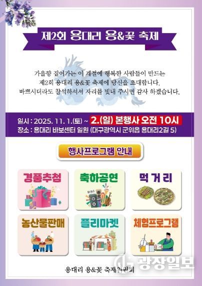 광장일보 주재영 기자 | 군위읍 용대리(이장 박영석)는 11월 1일부터 2일까지 용대리 바보센터(군위읍 용대2길 5)일원에서 주민 및 방문객과 함께하는 마을축제 ‘제2회 용대리 용&꽃 축제’를 개최한다고 밝혔다.