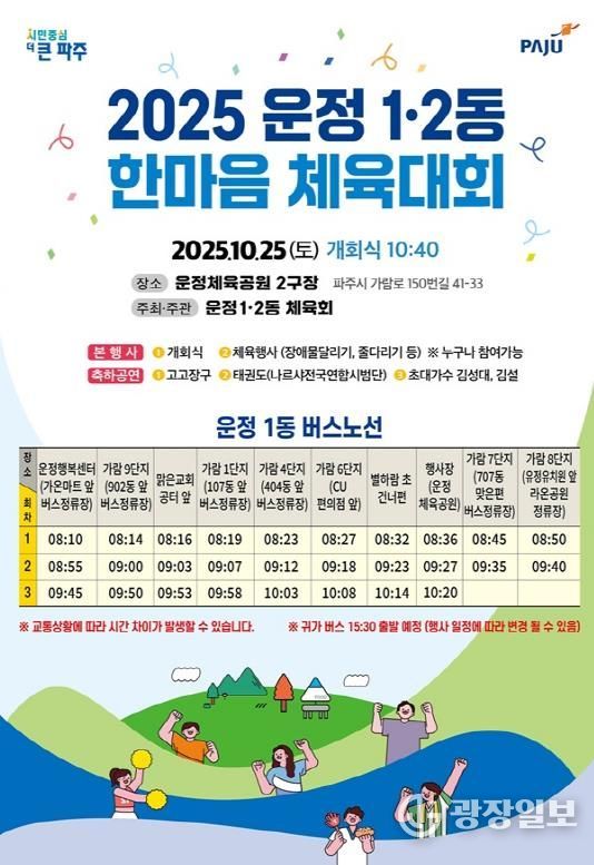 광장일보 주재영 기자 | 운정1·2동 체육회는 오는 25일 운정체육공원(가람로 150번길 41-33)에서 ‘2025 운정1·2동 한마음 체육대회’를 개최한다고 밝혔다.