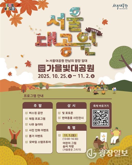 광장일보 주리아 기자 | 서울대공원 2025년 가을단풍축제 ‘가을빛대공원’이 10월 25일부터 11월 2일까지 서울대공원 일대에서 개최된다. 공원 전체를 가을빛으로 물들인 형형색색의 단풍을 즐길 수 있는 절호의 기회이다.