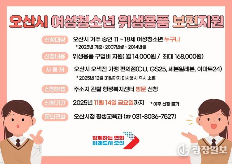 광장일보 나병석 기자 | 오산시는 여성청소년의 건강권 보장과 보편적 복지 실현을 위해 올해 처음 시행한 ‘여성청소년 위생용품 보편지원사업’의 신청을 오는 11월 14일 마감한다. 아직 신청하지 않은 대상자는 혜택을 받을 수 있도록 서둘러 참여해야 한다.