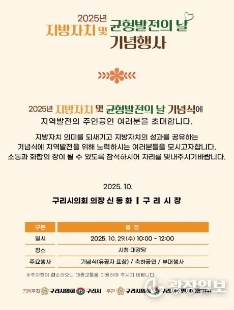 광장일보 주재영 기자 | 구리시의회는 오는 10월 29일에 구리시청 1층 대강당에서 ‘2025년 지방자치 및 균형발전의 날 기념식’을 개최한다.