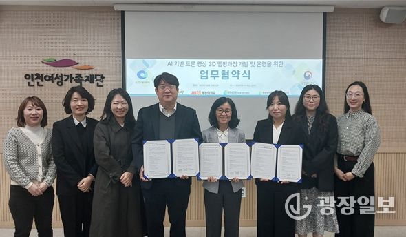 광장일보 주재영 기자 | 인천여성가족재단(인천광역여성새로일하기센터)과 재능대학교, 인천서구여성새로일하기센터는 10월 24일 여성 친화적 고부가가치 직업교육훈련과정인 ‘AI 기반 드론 영상 3D 맵핑 과정’의 성공적 운영을 위해 상호 협력하는 업무협약(MOU)을 체결했다고 밝혔다.