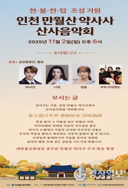 광장일보 주재영 기자 | 인천광역시는 오는 11월 2일 오후 6시, 남동구 간석동 만월산 약사사에서 ‘만월산 약사사 산사음악회’를 개최한다고 밝혔다.