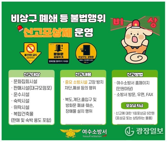 광장일보 주재영 기자 | 여수소방서(서장 서승호)는 소방시설 및 피난·방화시설의 불법행위를 시민이 직접 신고하면 포상금을 지급하는'소방시설 등 불법행위 신고포상제'를 적극 홍보 중이라고 30일 밝혔다.