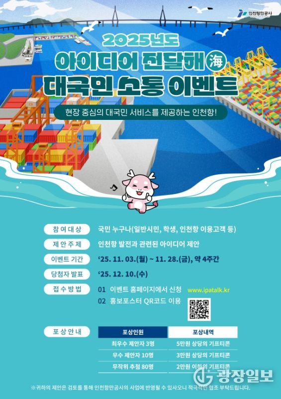 광장일보 주재영 기자 | 인천항만공사는 대국민·이해관계자와의 소통을 활성화하고 국민 제안을 인천항 운영에 반영하기 위해 ’2025년 아이디어 전달해(海)‘를 이달 28일까지 약 4주간 운영한다고 2일 밝혔다.