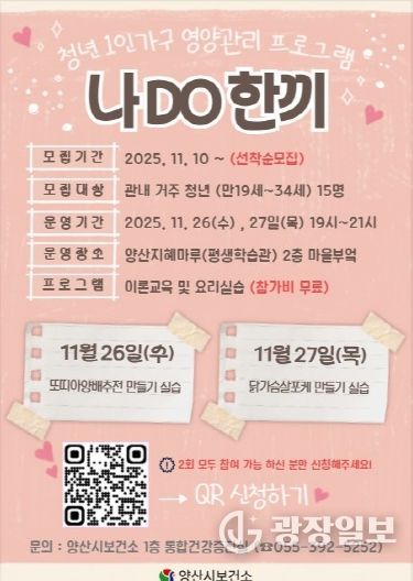 광장일보 주재영 기자 | 양산시보건소는 청년 1인 가구의 건강한 식습관 형성 및 자가 영양 관리 능력 향상을 위한 영양 관리 프로그램 ‘나DO한끼’를 11월 26일과 27일 양일간 운영한다고 밝혔다.