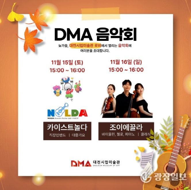 광장일보 이현나 기자 | 대전시립미술관은 11월과 12월, 미술관을 찾는 시민들에게 예술과 음악이 어우러진 특별한 시간을 선사하기 위해 ‘DMA 음악회’를 개최한다.
