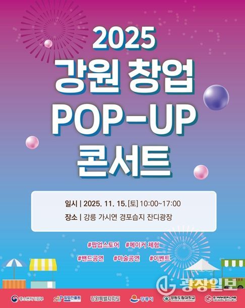 광장일보 이현나 기자 | 강원도립대학교는 오는 11월 15일, 강릉 경포 가시연 습지 잔디광장에서 도내 창업자와 지역주민이 함께 참여하는 '2025 강원 창업 팝-업(POP-UP) 콘서트'를 개최한다.